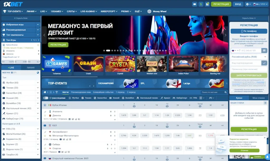 Ежедневно в линии появляется более 1000 игровых событий с десятками вариантов исходов на каждый матч. Live-ставки доступны с видеотрансляциями для топовых турниров. Быстрая регистрация на сайте занимает меньше минуты времени — выберите страну и валюту, система автоматически создаст аккаунт.